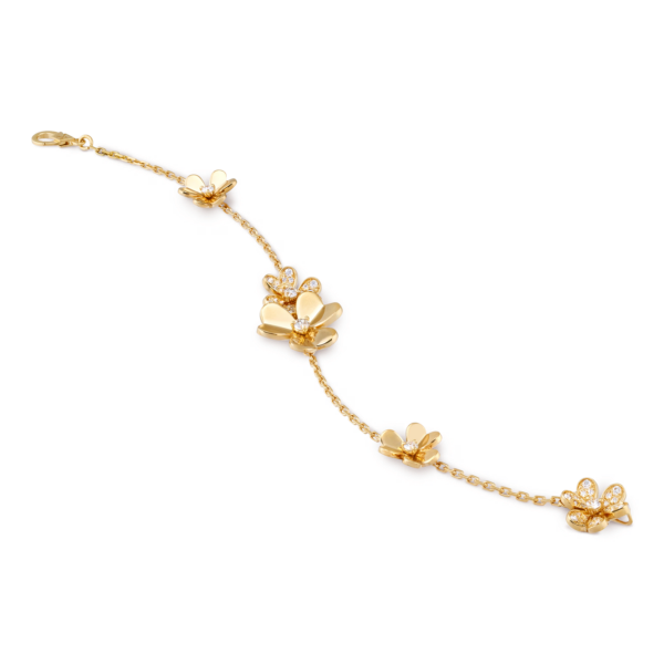 Ce bracelet se compose de cinq motifs floraux Frivole, délicatement disposés le long de la chaîne. Leur espacement équilibré crée un rythme gracieux au poignet, offrant une interprétation florale à la fois raffinée et vivante.