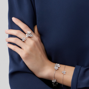 La collection Frivole célèbre l’éclat de la nature avec des fleurs finement sculptées qui semblent prendre vie à la lumière. Ce bracelet à cinq fleurs transforme le poignet en un jardin de reflets lumineux, incarnant fraîcheur, élégance et charme spontané.