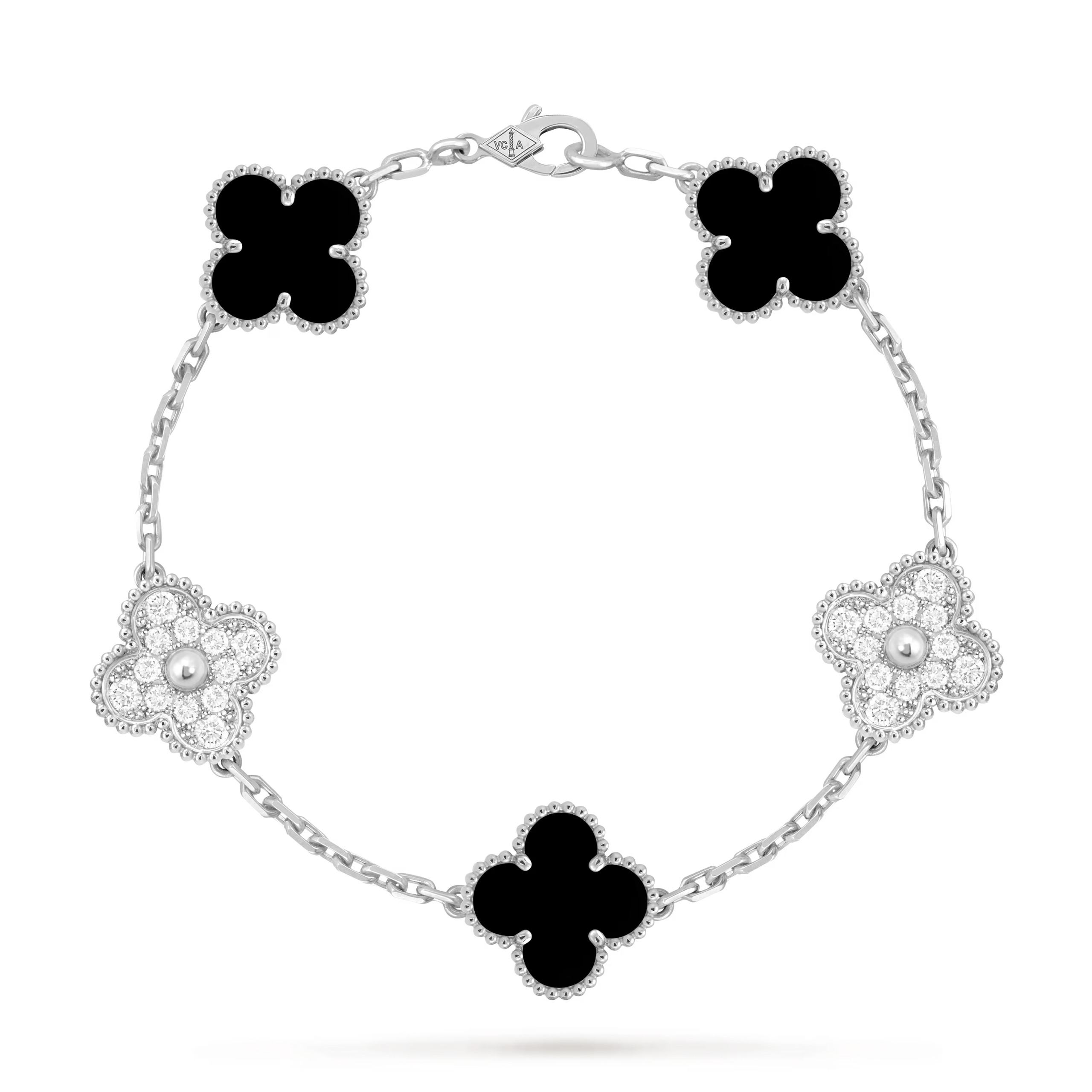 Ce bracelet présente cinq motifs Vintage Alhambra disposés avec une parfaite symétrie le long de la chaîne. L’espacement équilibré crée un rythme raffiné au poignet, mettant en valeur des proportions classiques et une sophistication durable.