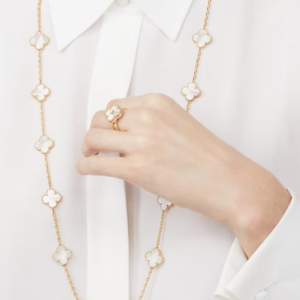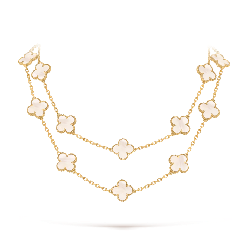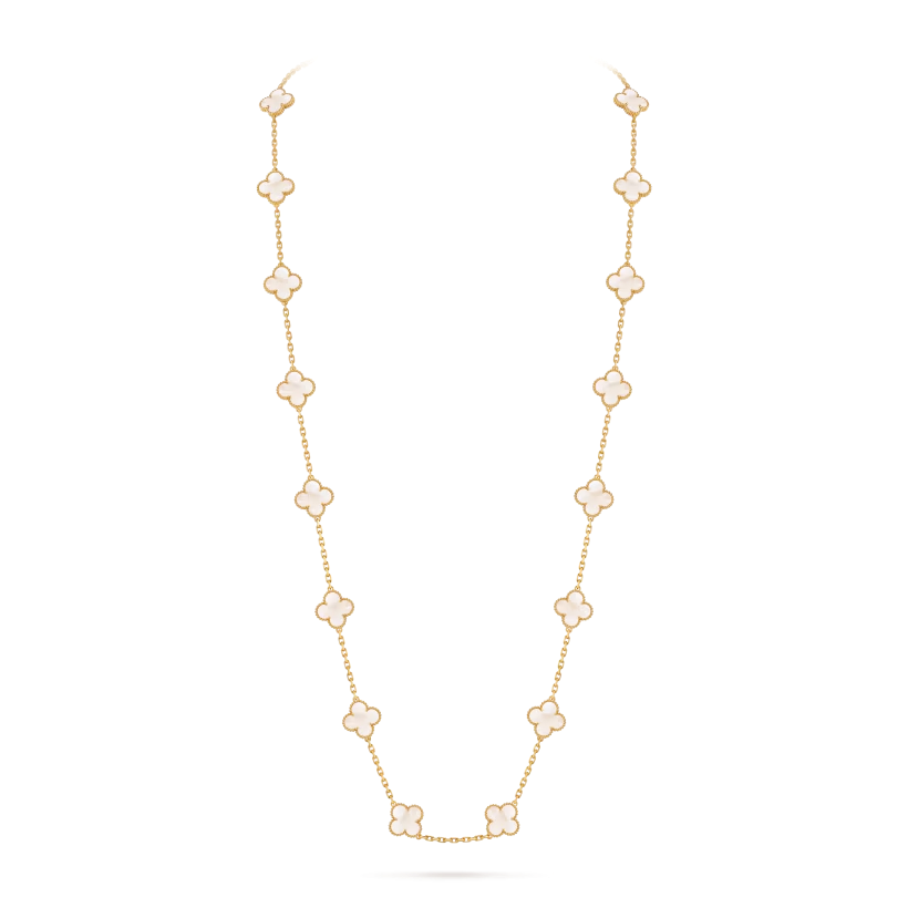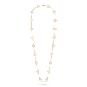 Élégant et iconique, le collier long Vintage Alhambra à 20 motifs incarne le savoir-faire intemporel et le style durable de la Maison.