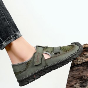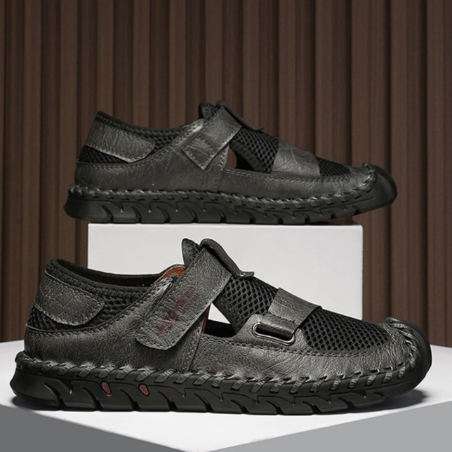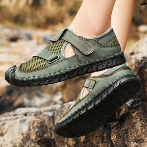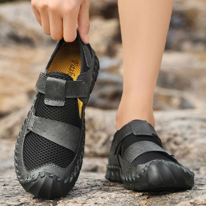 Le cuir véritable rencontre un mesh respirant pour offrir une adhérence optimale tout en assurant un maintien frais et stable. La semelle incurvée et la fermeture rapide par sangle garantissent une foulée fluide et un mouvement sécurisé, que ce soit en ville ou sur les sentiers.